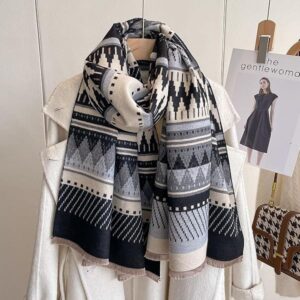 Beyond Joy Pashmina/Cashmere Substitute 100% Acrylic Shawl Scarf w Double sided Colors w 2 XL Geo Pattern Black, Gray & Beige