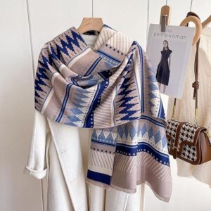 Beyond Joy Pashmina/Cashmere Substitute 100% Acrylic Shawl Scarf w Double sided Colors w 2 XL Geo Pattern Blue & Beige