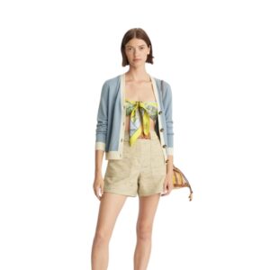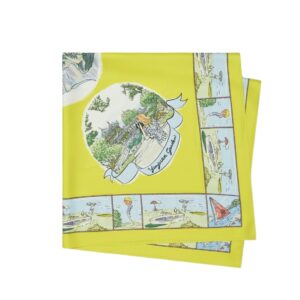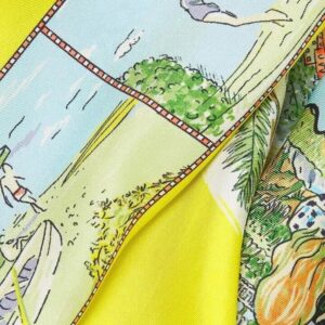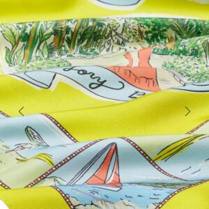 Inspired by vintage tourism scarves, vivid colors paint scenes of destinations around the world. Crafted in silk twill, the graphic border captures the spirit of summer travel with pictures of sailboats and sandy beaches. Wear it loosely draped, wrapped or knotted at the neck.