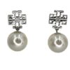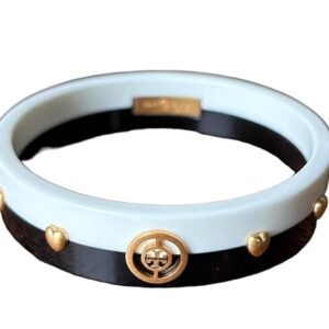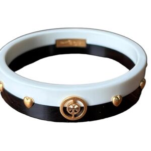 Tory Burch navy tone bangle with rolled brass in gold tone. Double T split circle and green tone gem in heart shape.