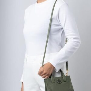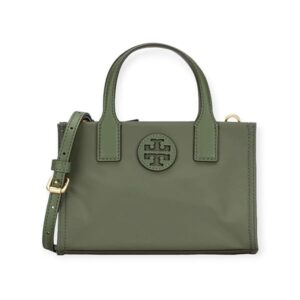 Tory Burch “Ella” tote bag in nylon Features logo patch on front Flat top handles, 7.4″ drop Open top with center magnetic closure; side snap closures Interior, one zip pocket and one slip pocket Lining: Recycled polyester