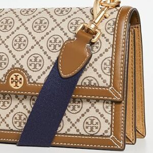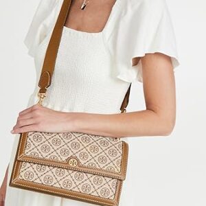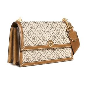 Tory Burch Women’s T Monogram Jacquard Shoulder Bag, Hazel, Tan, Graphic, One Size Features: Adjustable, Two Removable Web Shoulder straps, Flap top with snap closure. Interior Details: Center Zip Divides Interior; Two Slip Pockets, Four Card Slots, Easy-To-Clean Microsuede Lining Approximate Measurements: 6.6″H x 10.8″ W x 3.6″D.