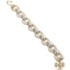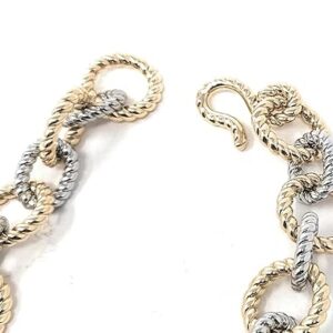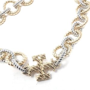 Tory Burch Women’s Textured Rope Mixed Metal Necklace (Tory Gold, Tory Silver), 17″, Metal, No Gemstone Textured links Double T logo Alternating colored links in gold and sliver tone metal. This necklace features a pressure clasp (hook and ring style), which opens and closes using gentle pressure. To fasten it, press firmly until you hear or feel a snap, indicating it’s securely in place. Don’t hesitate to apply a bit of pressure—this is normal. To remove it, simply push or pull gently in the opposite direction until it releases.