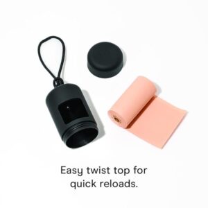 A happy home for your poo bags. Complete with an elastic strap to easily attach onto any leash or tote, a twist top to make reloading a breeze, and a complementary roll of our eco-friendly Poop Bags!